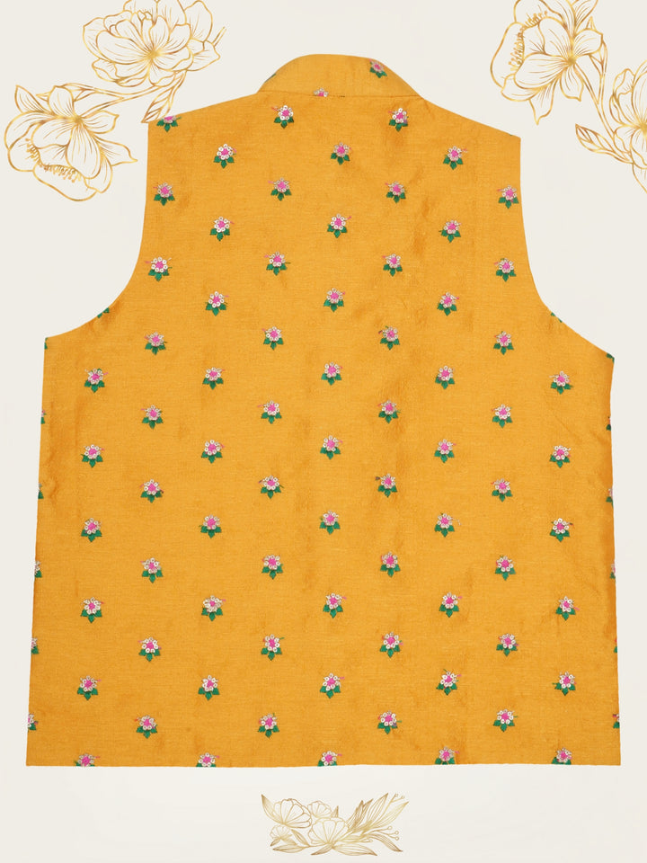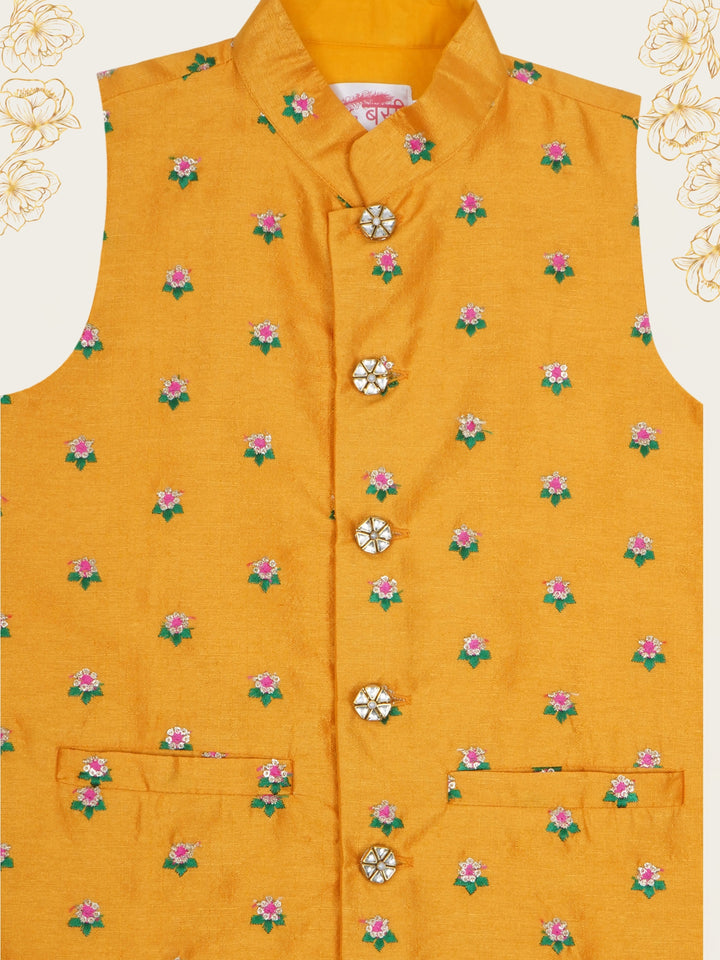 Boys Yellow Mulberry Silk Floral Boota Embrodiered Nehru Jacket
